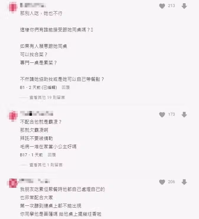 也有網友熱心給建議,「買外面的素食餐裝在盤子給她吃」、「我身邊很多素食者,也沒有誇張到別人吃也不能欸,像個人火鍋什麼的,她們點素食鍋就好啊?