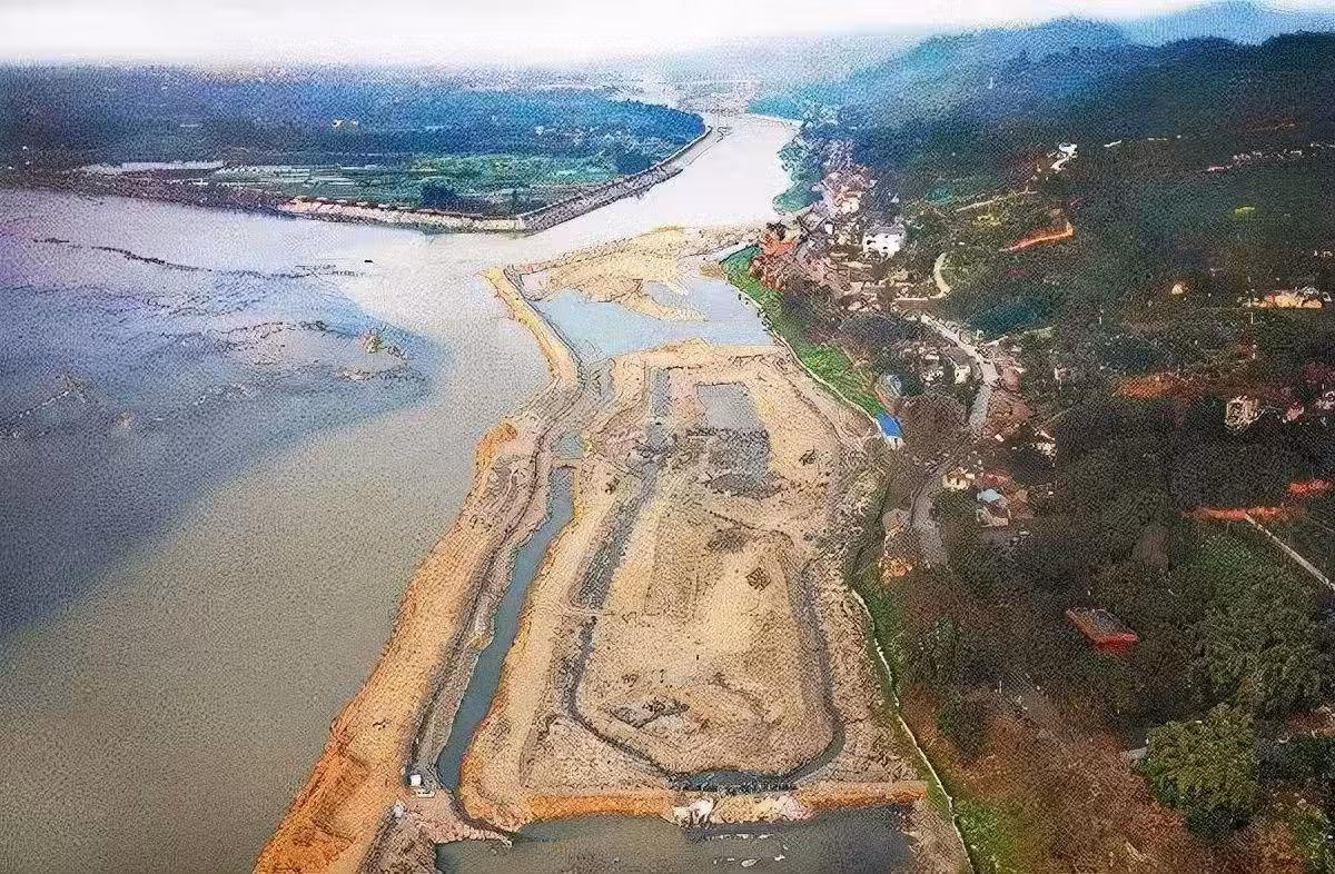就是把砂石倒在江中,把湍急的水流阻斷,修建圍堰,再把水抽干開始挖掘。