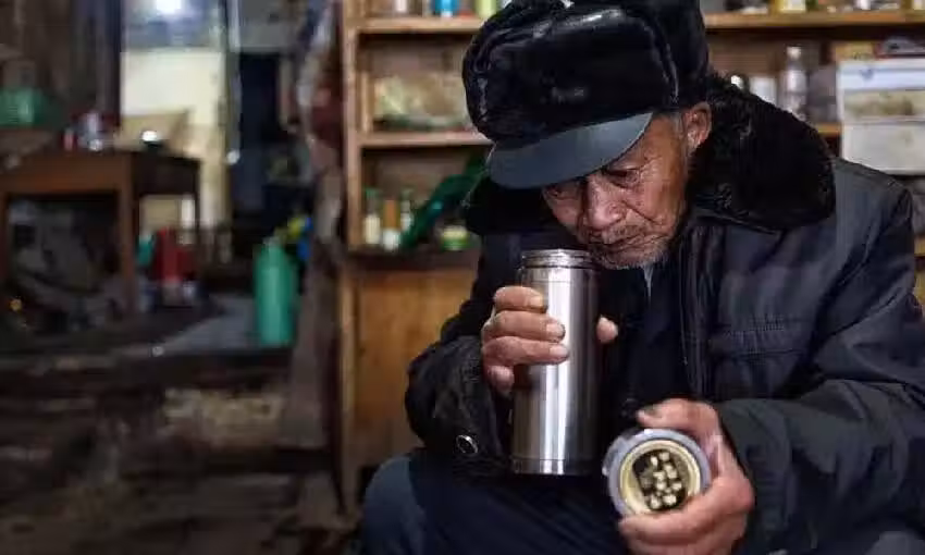 每天悠然自得地遛彎、下棋,對喝水也是不緊不慢。