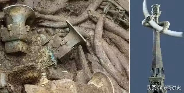 三星堆祭祀坑出土的象牙和大立人持象牙假想圖