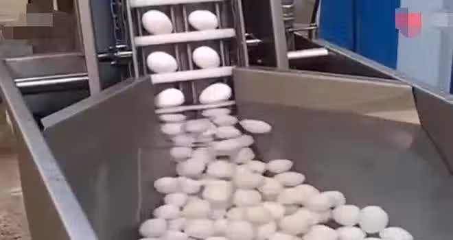差不多的時候就生蛋,雞蛋生出來就會隨著滑板滑到滑輪上,然後再統一滾落進清洗池,進行清洗後還有儀器檢測雞蛋的質量,不合格的就會被挑出來。