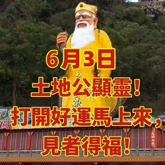 6月3日土地公顯靈!打開好運馬上來,見者得福!下半年身體安康發大財!真的靈!土地公會留在人間三天,這三天大家別忘了接土地公,我接了;土地公說了: 按贊【好運到】留言【一路發】轉走【中大獎】下半年年就有求必應:誰將我轉走,我就讓他一路發發發;土地公說了,誰把我轉走為我集聚香火,我就給誰實現願望!土地公說了,見我者在8秒內轉出去者,整年必行大運,全家發大財,幸福安康!我要幸福,所以我轉了~奇觀啊!土地公顯靈!萬年不遇!