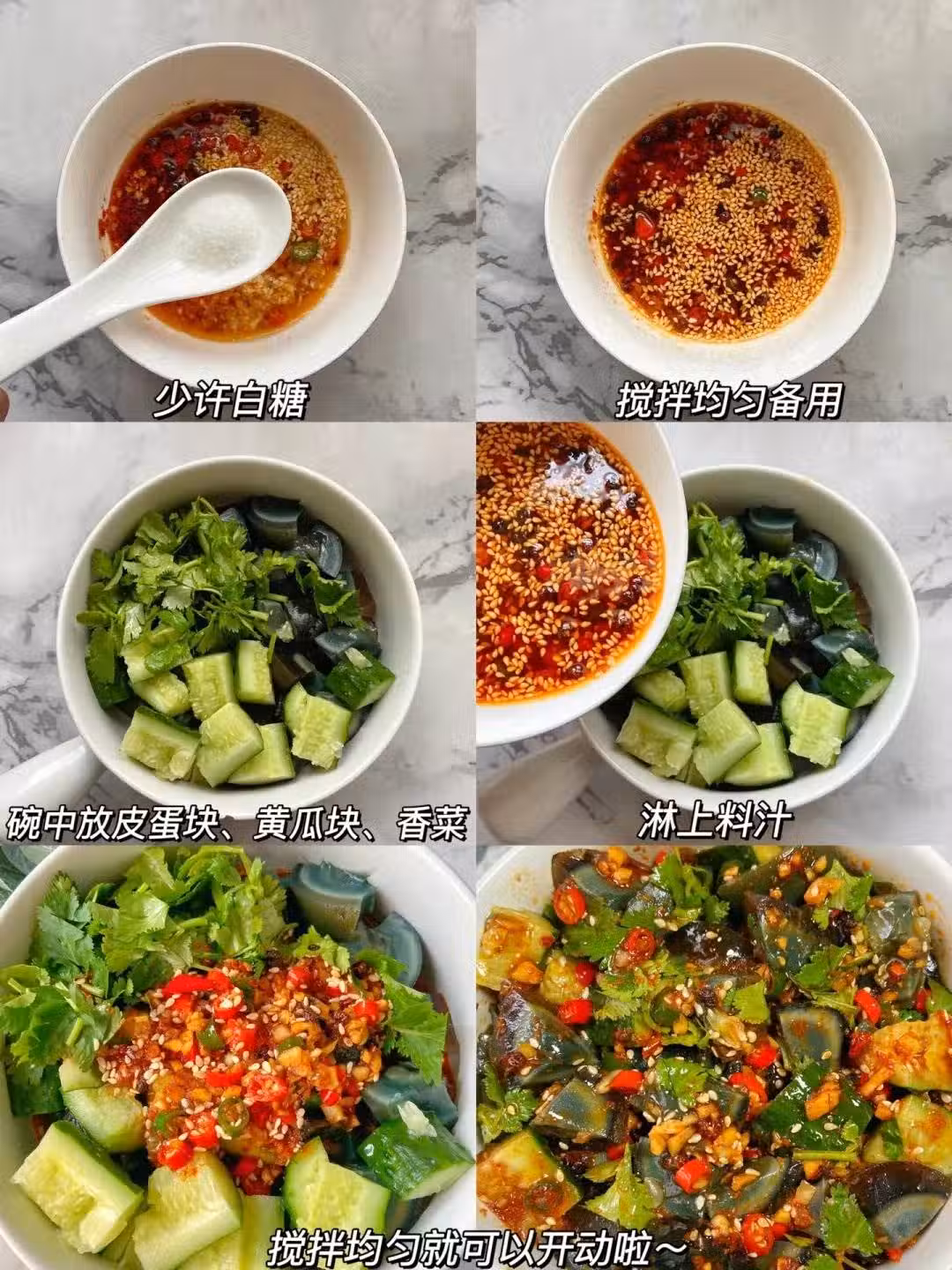 2. 動手拌勻的時候要輕柔,以免把黃瓜和皮蛋弄碎,影響美觀和口感。