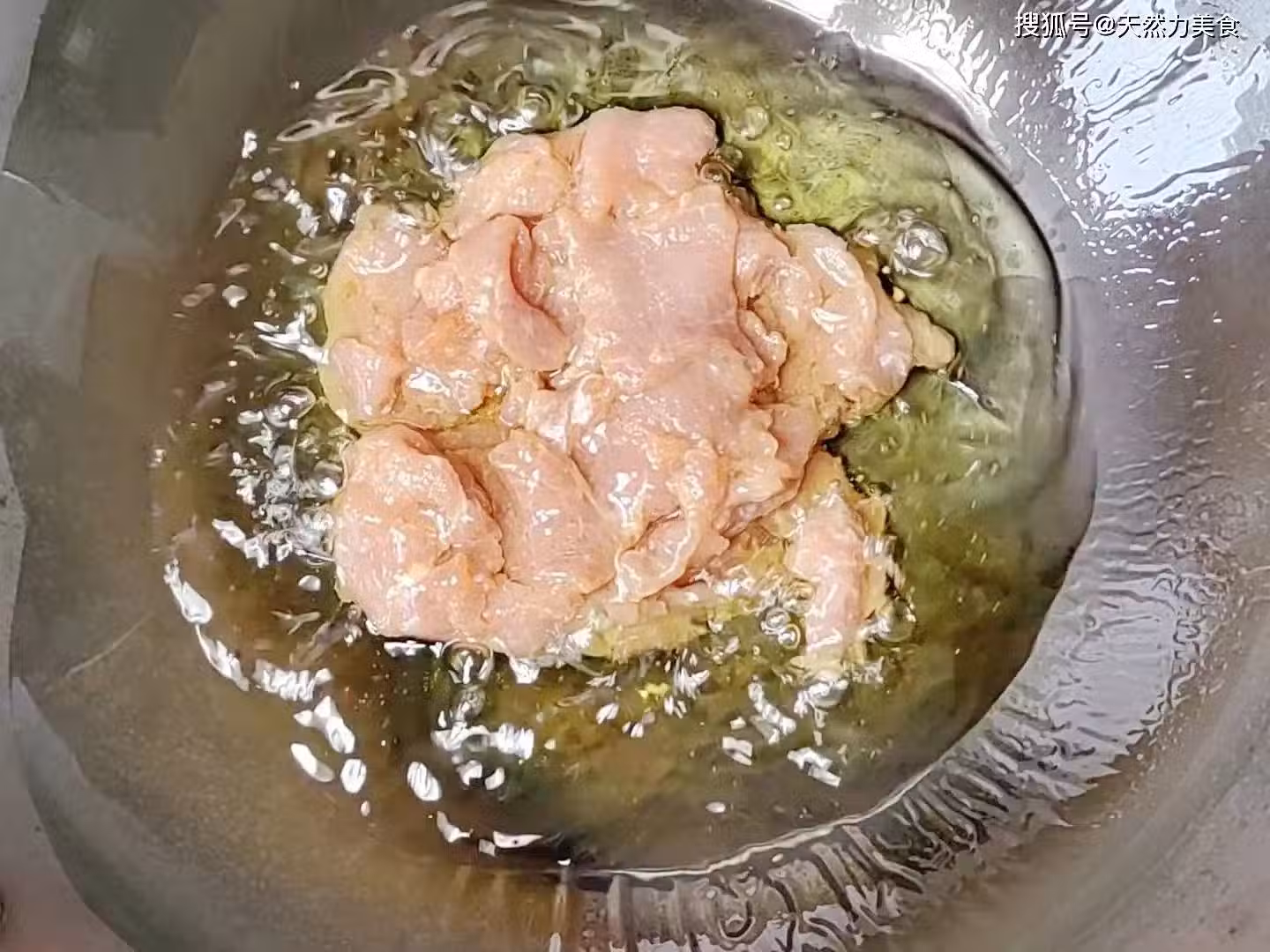 2、肉片下鍋後看到變成白色就說明火候到了,這個時候的肉片應該有6成以上的熟度,整個過程大概在15秒左右,把肉片先打出備用。只打肉片,油留鍋內待用。