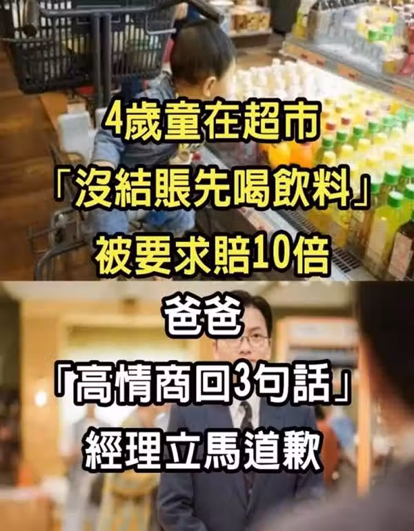 4歲童在超市「沒結賬先喝飲料」被要求賠10倍 爸爸「高情商回3句話」經理立馬道歉!
