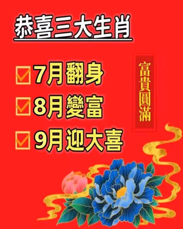 恭喜三大生肖,7月翻身,8月變富,9月迎大喜,富貴圓滿