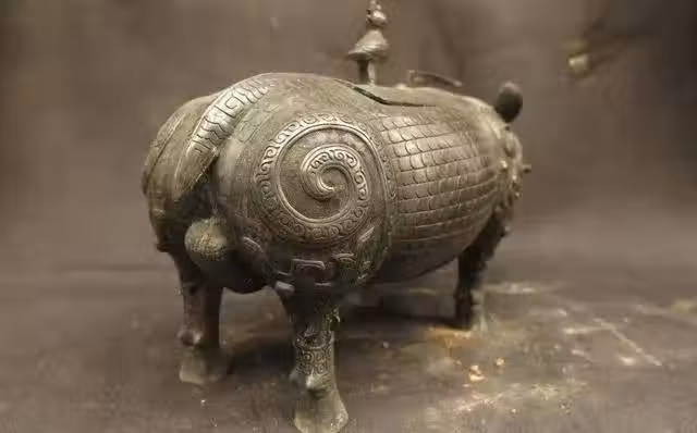 而之所以以野豬為器物形制,是因為商周時期的象生動物具有表意的功能及象徵的意味,作為人們與神靈溝通的媒介,起著娛神和避邪的功效。當然,這件青銅器也有其現實功用,那就是作為「酒器」,可以供人們儲酒用。此器重達30多公斤,容積有13升,盛滿後,一個人都難以搬運。其背部的橢圓形孔,是酒器的出口。由於豬尊盛酒後難以倒出,所以應該配有取酒的勺。