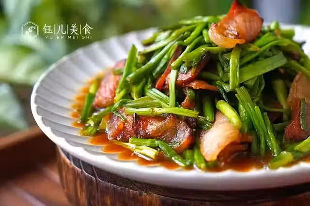 食材:臘肉200克、水芹400克、辣椒2個、生抽一小勺、鹽少許