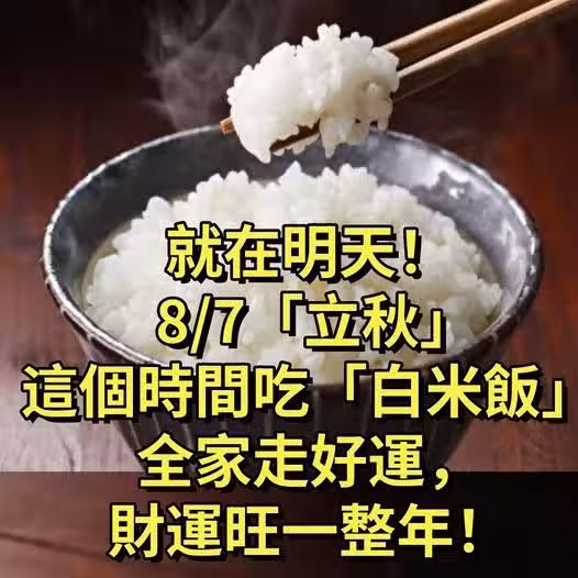 就在明天! 8/7「立秋」這個時間吃「白米飯」全家走好運,財運旺一整年!