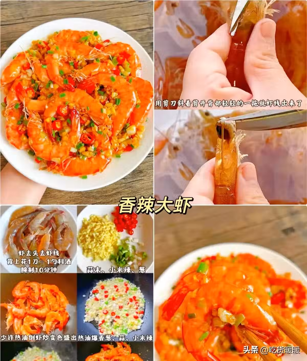 用剪刀斜著剪開背部輕輕的一拖就蝦線出來了香辣大蝦蝦去頭去蝦線背上花1刀1勺料酒腌制10分鐘 蒜末、小米辣、蔥少許熱油倒蝦炒變色盛出熱油爆香蔥、蒜、小米辣1勺蚝油、少許糖 撒上蔥花出鍋2勺生抽 倒入蝦翻炒均勻。