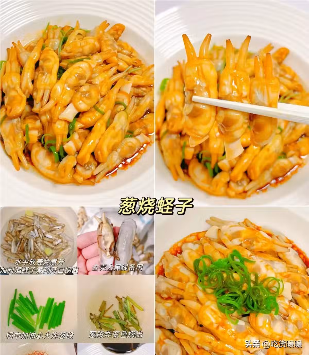 水中放薑片煮開加料酒蟶子煮到開口撈出 去殼去黑線備用 鍋中加油小火炸蔥段 蔥段炸變色撈出 小火加熱到微微冒泡 澆在蟶子上拌勻 好吧 加兩勺生抽一勺蚝油。