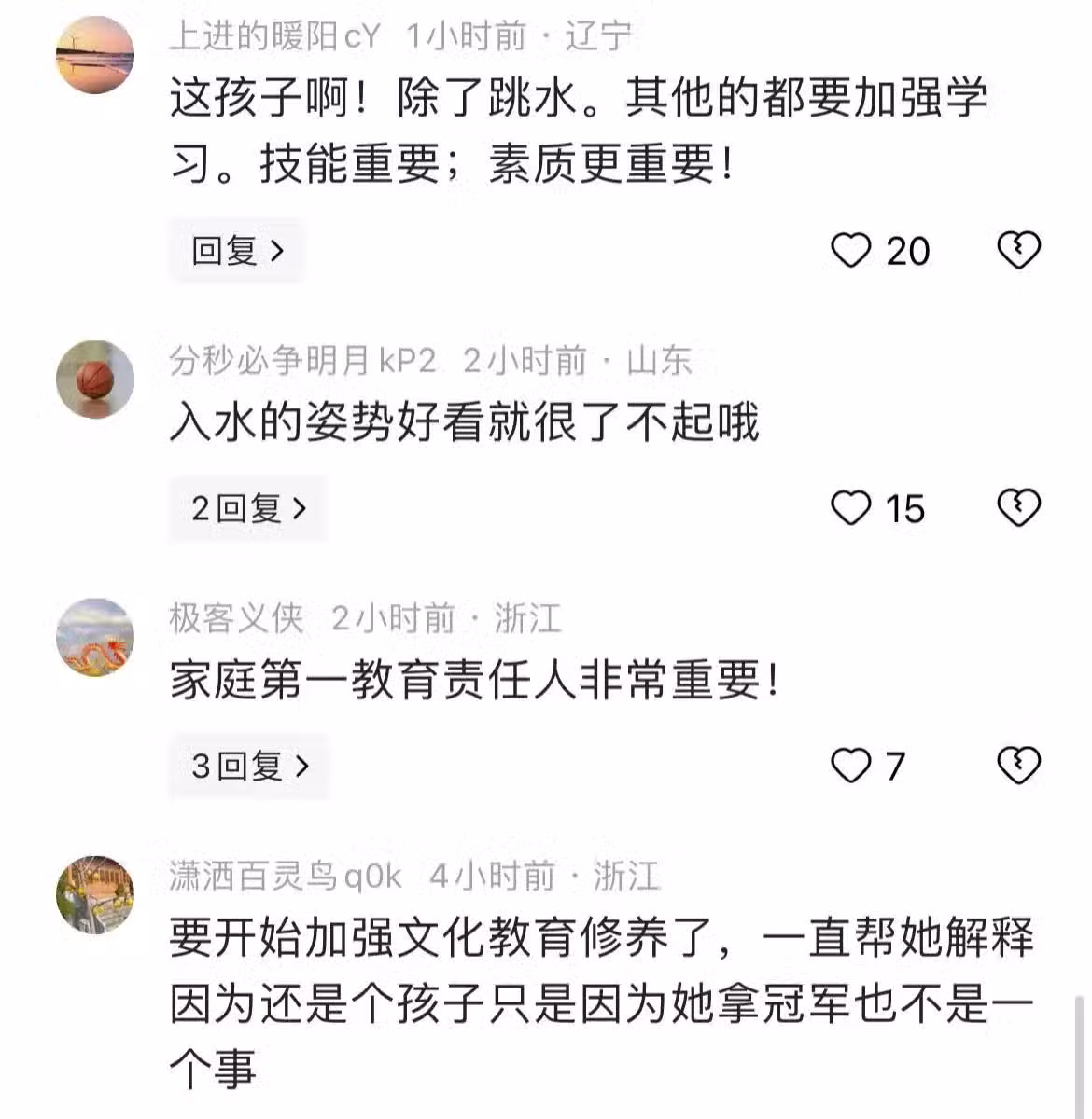 有人建議:要開始加強文化教育修養了,一直幫她解釋因為還是個孩子只是因為她拿冠軍也不是一個事。