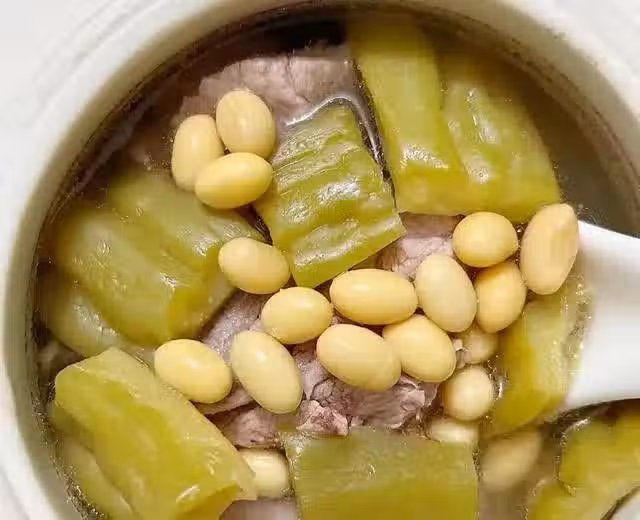 2、鍋里加水,煮開後放入薑片料酒和豬骨煮3分鐘,撈出洗凈備用;豬骨、苦瓜、黃豆放入燉鍋;燉1.5小時,加鹽調味就可以啦