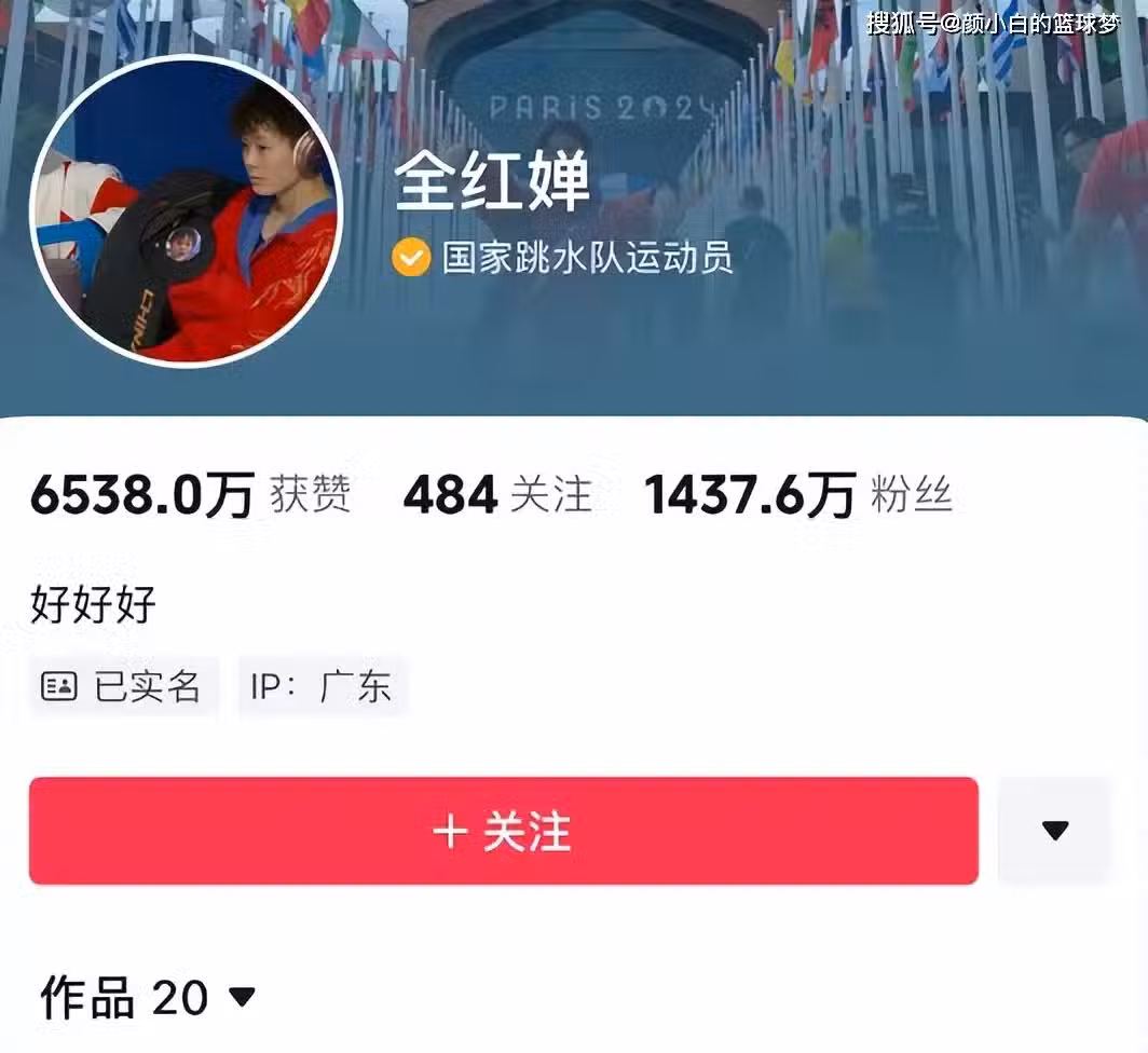 巴黎奧運會之前全紅嬋的粉絲數是730萬左右,巴黎奧運會後截止北京時間8月24日上午10點40分,全紅嬋抖音粉絲已經高達1437.6萬,20多天的時間粉絲提升700萬+,這已經是一個超級現象級大網紅。