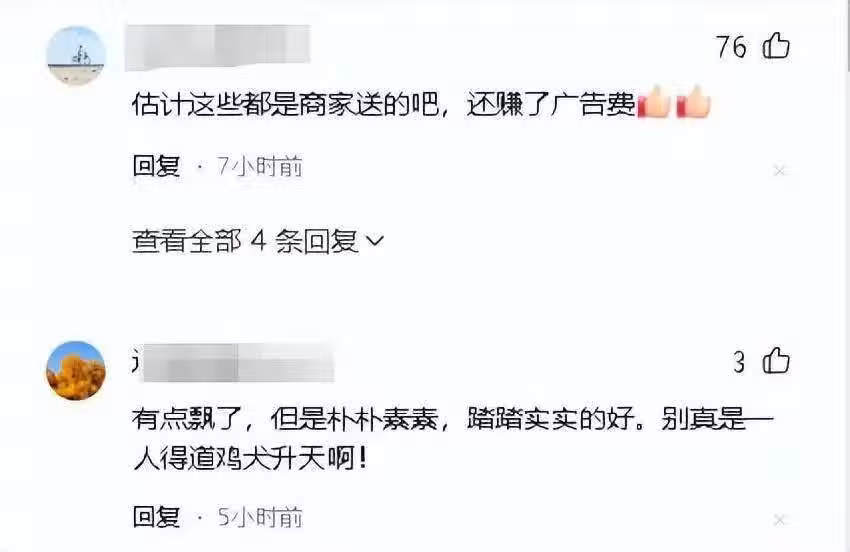 也有人說她這或許都是商家送的,雙方都是互利共贏的局面,一個喜歡,一個能勝很多宣傳費,但是有部分網友指出她像是有點飄了,樸素她是一點挺好的。
