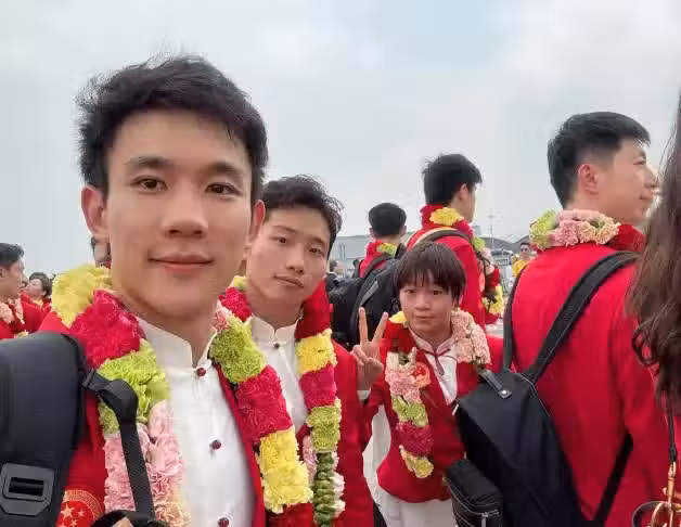 中國奧運健兒訪問團隨後乘坐大巴去往酒店。酒店外面有上百位市民和遊客在等候,希望一睹中國奧運冠軍的風采。有人手持孫穎莎和王楚欽頭像的扇子,也有人手持玩偶要送給全紅嬋。全紅嬋收到了一個漂亮的玩偶,她顯得非常開心。