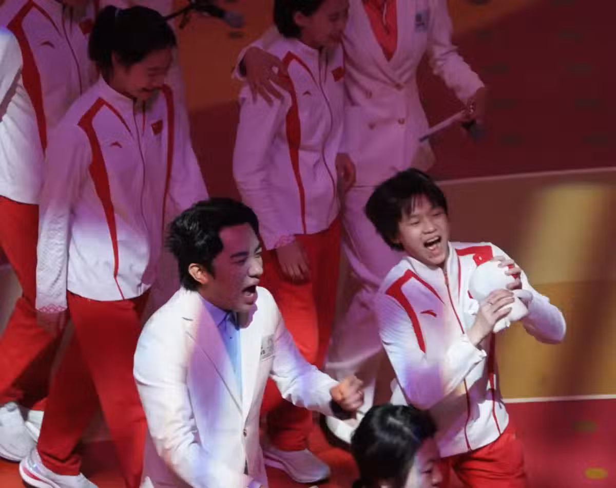 中國奧運健兒代表團訪港大匯演上,全紅嬋和娛樂明星王祖藍首次見面,但是兩人一見如故,頻繁進行互動,最後兩人手挽手蹦跳著離場,網友們感嘆:「兩大e人都好可愛!」