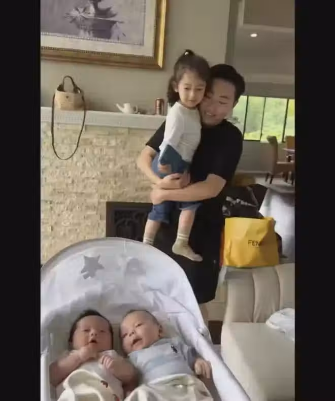 7月16日,葉海洋曬出了雙胞胎兒子在美國的近照。只見葉海洋背著二女兒過來見他的兩個弟弟。兩個弟弟被放在同一個搖籃里。他們的髮型、體型、五官幾乎一模一樣。他們是雙胞胎。