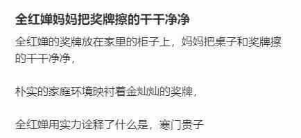 網友留言:全紅嬋的榮譽,樸實的家庭環境映襯著金燦燦的獎牌。