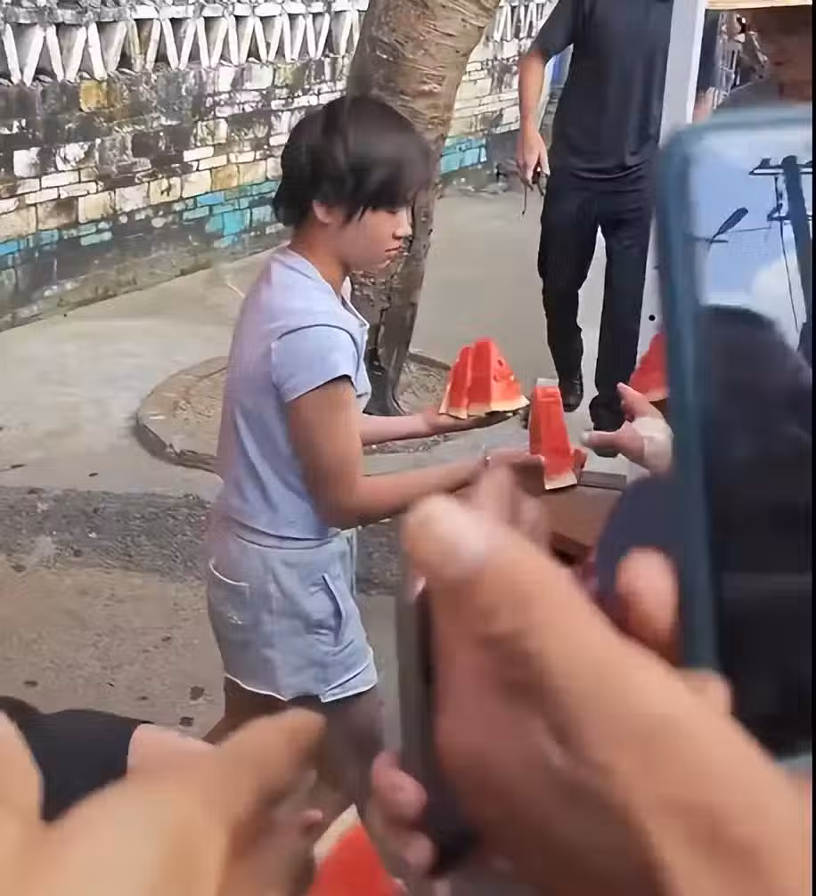 分發完西瓜,全紅嬋又端了哈密瓜出來,分發給群眾。不得不說,全紅嬋一家人都很樸實。此前,全紅嬋的老爸全文茂曾經請圍觀的群眾吃月餅。有網友表示:「甜到心裡了。」