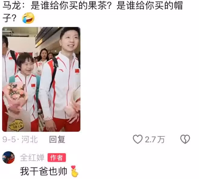 之前的港澳行,全紅嬋成為團寵,認識了很多其他項目的好朋友,馬龍給她買果茶、買帽子,她叫馬龍為乾爸,在社交平台上,有人曬出了馬龍和全紅嬋的合照,全紅嬋親自回復並爆笑調侃馬龍:我乾爸也帥。這就是17歲的全紅嬋,好玩又調皮,但是在訓練場和比賽場上,全紅嬋卻特別嚴肅認真,奧運會結束後,就讓全紅嬋好好玩,使勁放鬆一下吧。