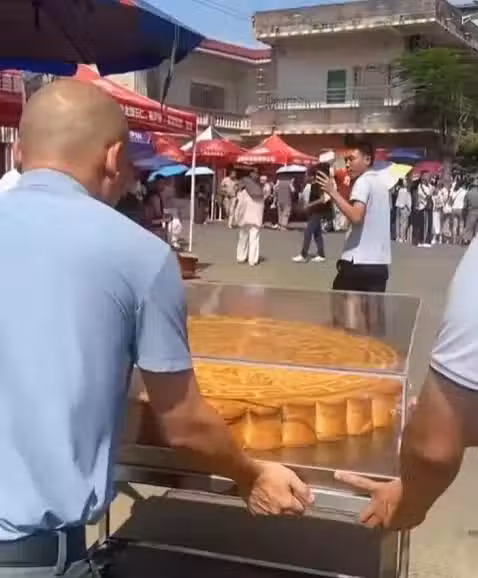 月餅正被師傅們推向全紅嬋老家,一路吸引了非常多的網友拍照,很喜慶的畫面。