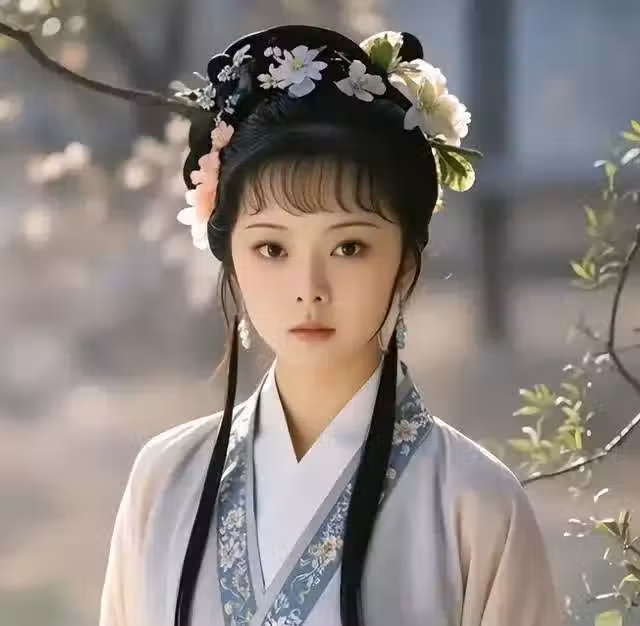 還有一張圖片中的譚松韻身穿紫色夾綠色繡花的漢服,用花朵和其枝葉作為髮飾.