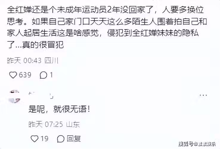 網友:全紅嬋還是一個未成年的運動員,2年沒有回家了,人要多換位思考一下,全紅嬋家人的隱私真的被冒犯到了,很無語。
