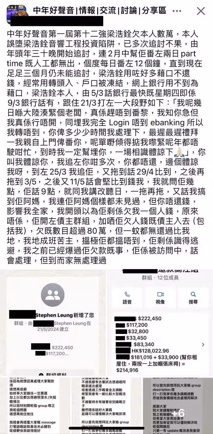 從債主們的截圖看到,一共有7位債主加入群組,欠款從3萬到20萬不等。而疑似梁浩銓更發聲表示自己周轉不靈,希望各位體諒,高抬貴手別再爆料,他會儘快還清欠款。