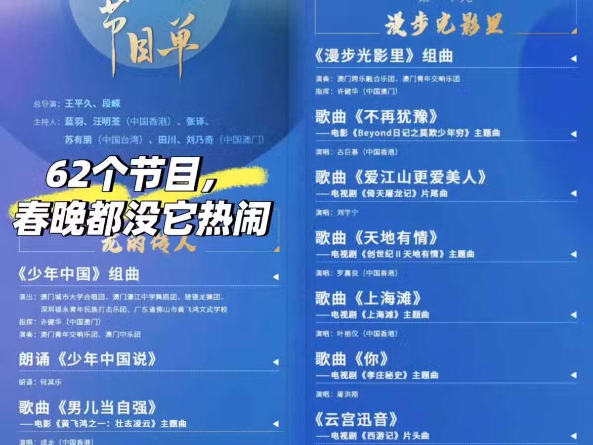 晚會總共安排有62個節目,網友打趣春晚都沒它熱鬧,堪稱一場音樂盛宴,惹千萬網友為之瘋狂,當晚熱搜話題都快被晚會給包了。