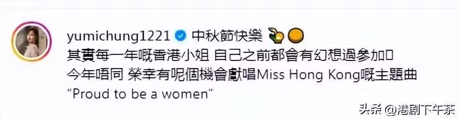 另外,她早前與詹天文及王灝兒(JW)為港姐獻唱主題曲《Proud To Be A Woman》,並擔任表演嘉賓,事後她在社交網分享靚相。