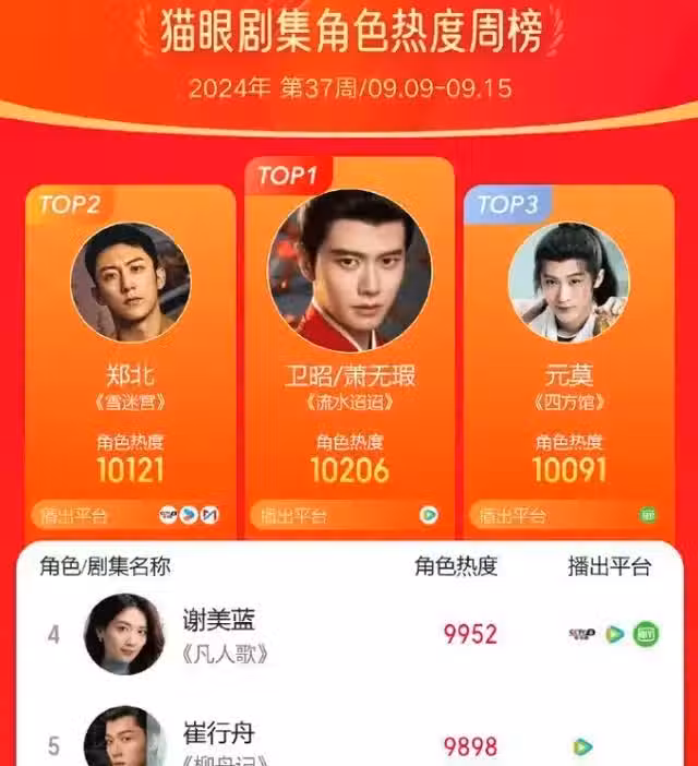 角色熱度周榜:任嘉倫扮演的衛昭登頂,,黃景瑜扮演的鄭北是亞軍!
