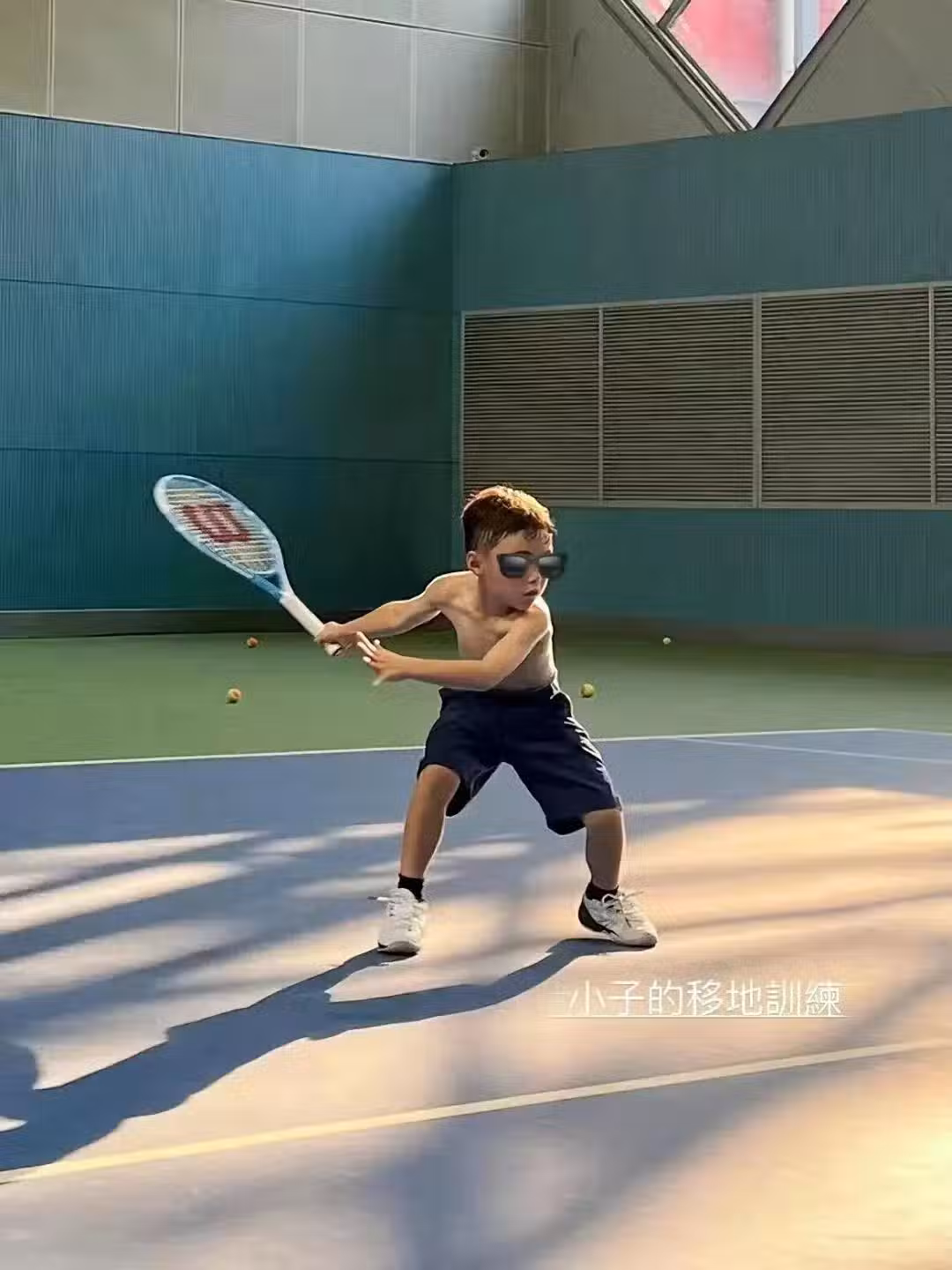 此番拍攝,她正在陪兒子 Romeo 在 打網球。