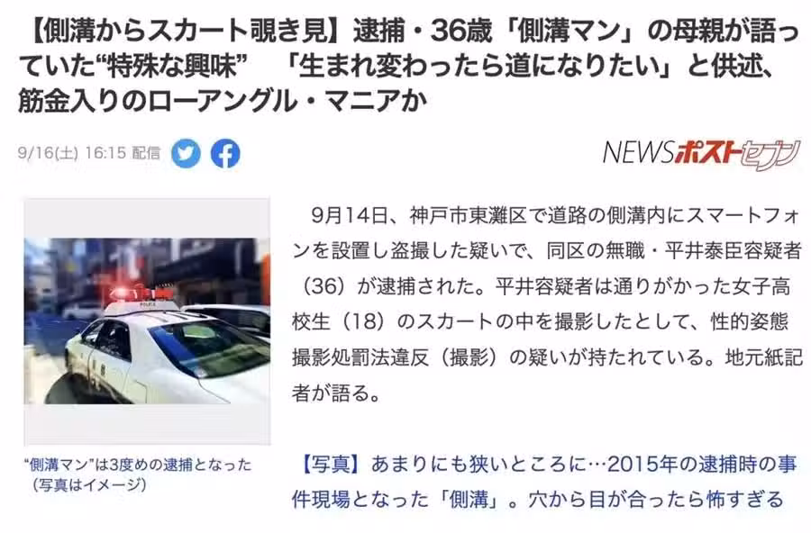這名男子名為平井康臣(36歲),在日本神戶市是失業狀態。他被捕是因為他將手機放置在神戶市道路旁的下水道內,試圖[偷.拍]路過女性的裙底風光而涉嫌違反《[偷.拍]處罰法》。
