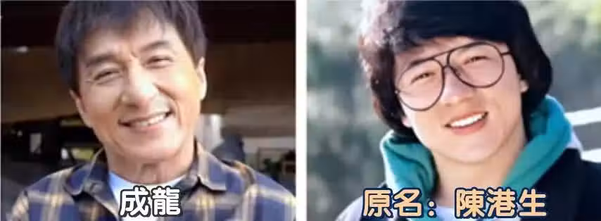 成龍的名字也是極有意思的。成龍父親房道龍早年曾在國民黨軍隊服役,隨國共內戰走出內地到香港避禍,改隨妻姓陳,更名為陳志平,所以成龍1954年出生時候的名字是陳港生,後認祖歸宗,改為房仕龍。