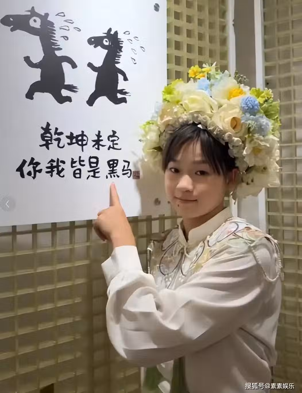 全紅嬋指著身後的標語「乾坤未定,你我皆是黑馬」。