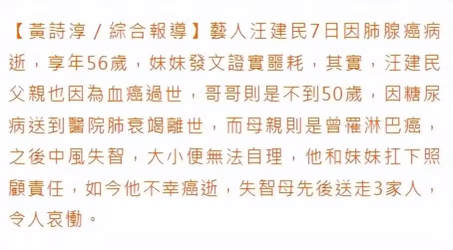 汪建民家人命運也十分悲慘,父親因為血癌過世,哥哥不到50歲因糖尿病送到醫院肺衰竭離世,母親幾年前患上淋巴癌成功治癒,但她大小便失禁不能自理,如今更是白髮人送黑髮人。