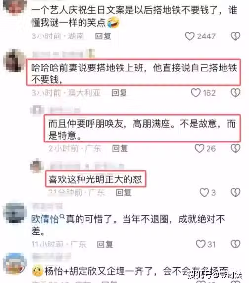 最搞笑的是,郭晉安配的文案是:「以後搭地鐵不要錢了」,不少網友紛紛評論:「一個藝人慶祝生日文案是以後搭地鐵不要錢了,誰懂我迷一樣的笑點。哈哈哈,前妻說要搭地鐵上班,他直接說自己搭地鐵不要錢。而且還要呼朋喚友,高朋滿座,不少故意,而是特意。喜歡這種光明正大的懟。歐倩怡可惜了,當年不退圈,成就絕對不差。楊怡跟胡定欣又站一起了,會不會有名場面。」