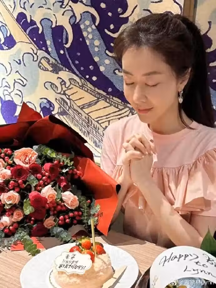 相中,只見「壽星女」身穿淡粉色雪紡連衣裙出鏡,長發簡單綁成高馬尾,皮膚白皙滑嫩、臉上膠原蛋白滿滿,少女氣息十足,絲毫看不出已是一位兩娃之母,不愧為模特出身。