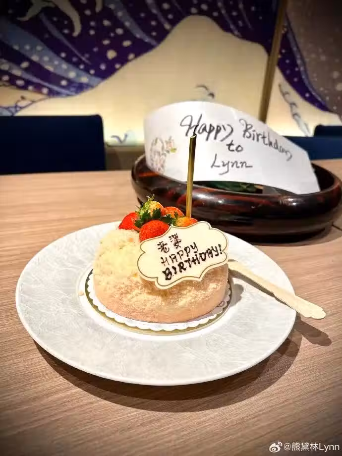 另一張照片,系熊黛林收到的生日禮物——精緻草莓蛋糕與一大束玫瑰花,標籤上寫有「Happy Birthday to Lynn」字樣,正是出自郭可頌之手,他甜蜜表白稱「老婆,生日快樂」!