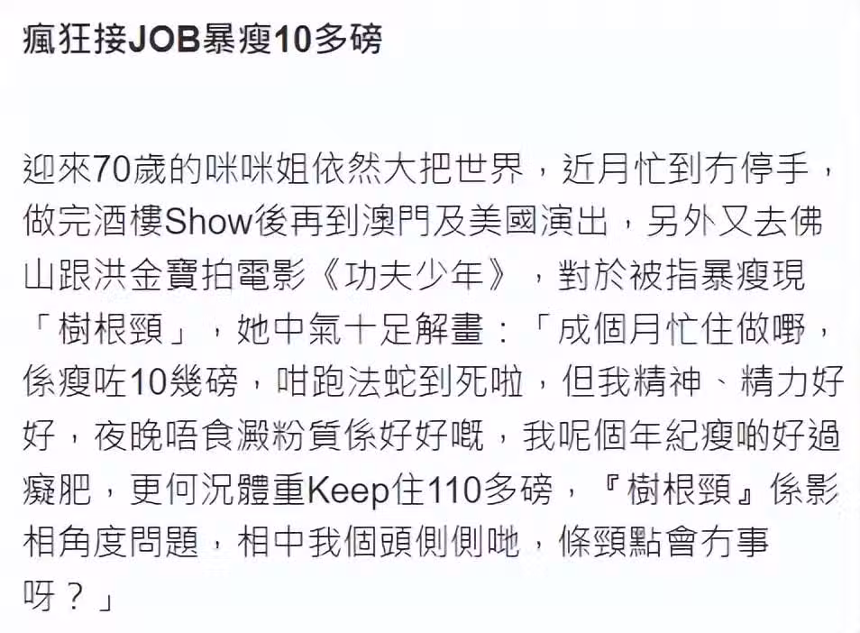 朱咪咪錶示自己的體力很好,晚上不吃澱粉食物,這個年紀瘦一點比肥胖更好,體重約100斤。