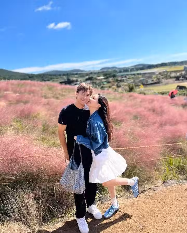 「靚湯」在老公馬國明的陪伴下旅程特別幸福,兩個人在粉色的花海前留下親吻的靚影。