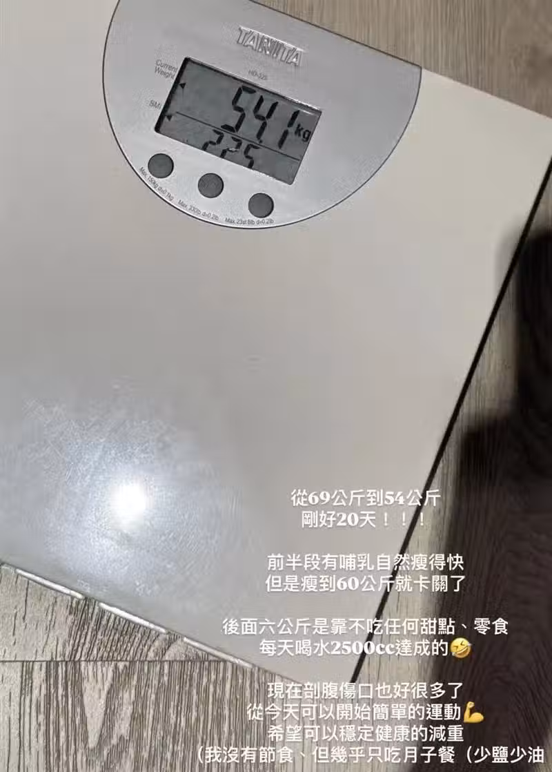 而剩下的6公斤則是靠不吃甜點、零食,每天喝水2500cc成功減掉,「現在剖腹傷口也好很多了,從今天開始可以簡單的運動,希望可以穩定健康的減重。」