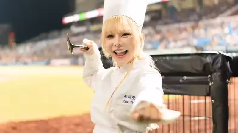 ▲苡萱扮成「廚師」,穿上白色廚師服,象徵性地「除掉獅子」,現場上萬球迷朝聖樂天逆轉勝。(圖/樂天提供)