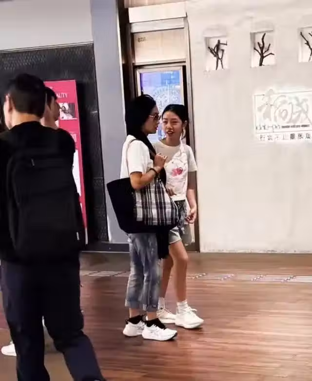 由於朱茵的皮膚一直偏黑,所以鏡頭下的她看起來也是有些憔悴,加上沒怎麼化妝,狀態難免顯得有些疲憊。她身旁則是女兒黃鶯,小傢伙今年12歲了,個頭就快追上媽媽,她穿著短褲背心,四肢看起來很纖細。