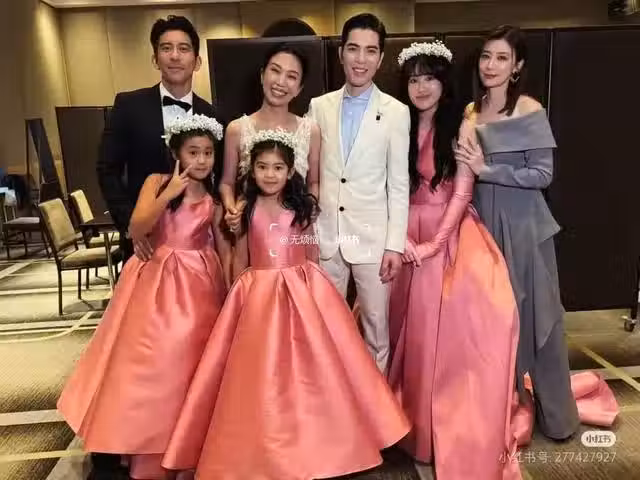 賈靜雯一家參加蕭敬騰婚禮,三朵金花都好美,二女兒咘咘最像媽媽