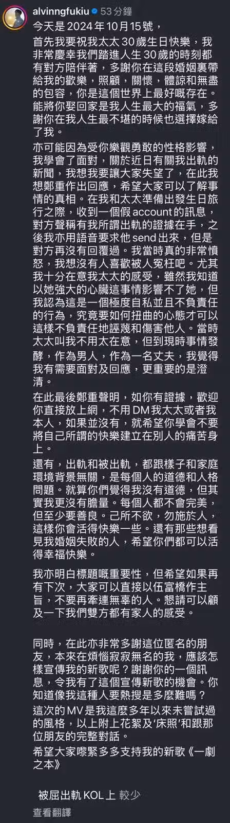 在此最後鄭重聲明,如你有證據,歡迎你直接放上網,不用DM我太太或者我本人,如果並沒有,就希望你學會不要將自己所謂的快樂建立在別人的痛苦身上。