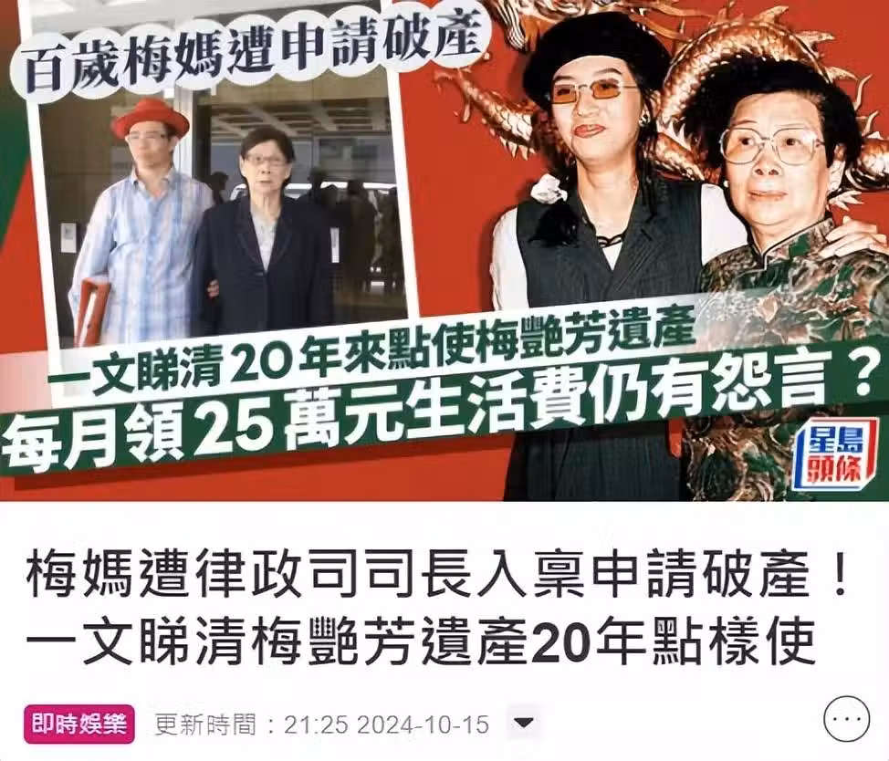 梅艷芳兄弟姐妹四人,三人皆因為癌症去世,唯一健在的哥哥梅啟明多次慫恿梅媽爭奪遺產,最終導致100歲的母親被申請破產,官司將在12月3日開審。