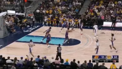 里夫斯、濃眉、克里斯蒂一邊拉開,拉塞爾外線牽制,帶來的詹姆斯一路碾壓太陽球員完成漂亮的突破。單看這個回合,詹姆斯依然有著聯盟頂級攻堅能力。無奈歲月催人老。