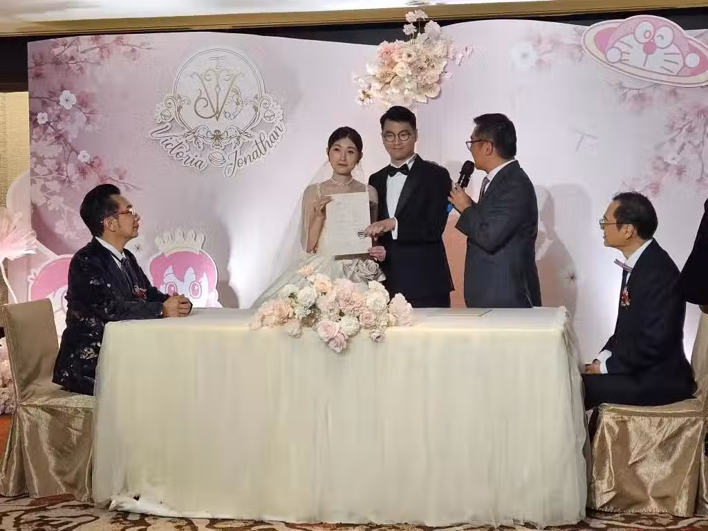 麥翠嫻嫁女當天喜氣盈門,大女兒龔敏晴的婚禮於晚上7時開始,一眾賓客步入童話般的婚禮現場,見證一對新人展開人生新一頁。新娘龔敏晴在父母的陪同下,穿上由設計師量身訂做的婚紗步入會場。